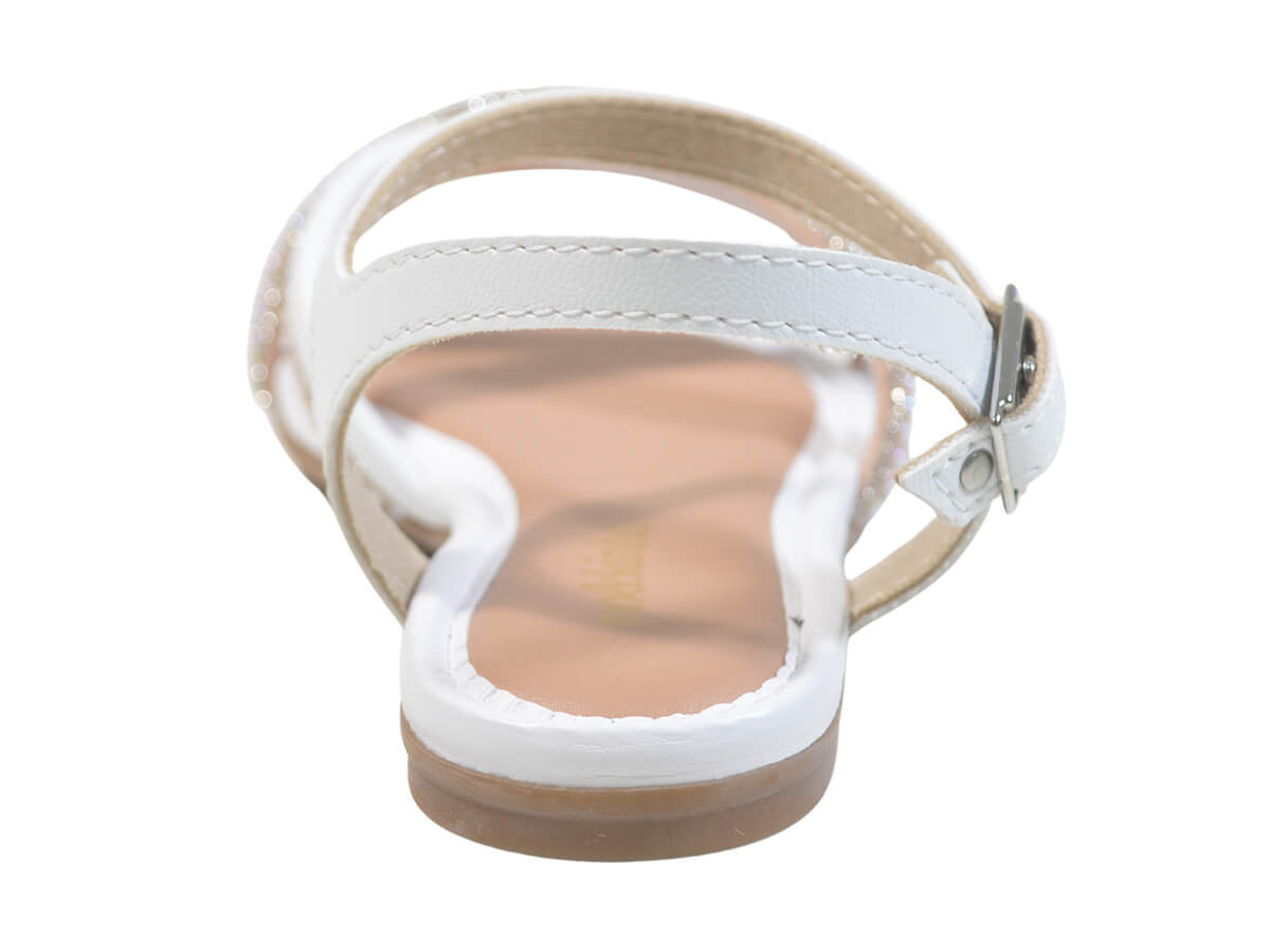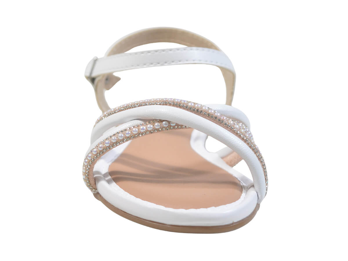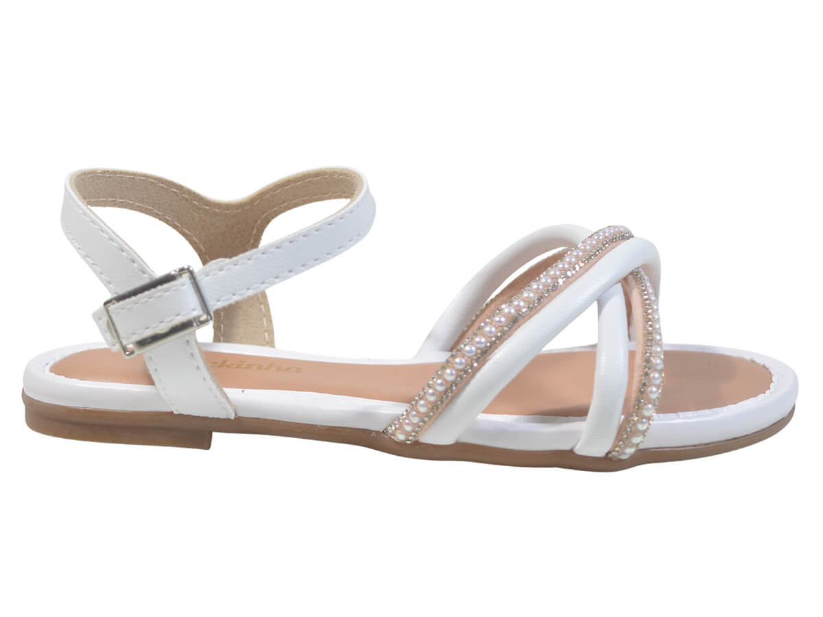 A Sandália Molekinha aposta em delicadeza com tira decorada por cristais e pérolas. Confortável, com fivela ajustável e acabamento macio, é perfeita para ocasiões especiais com toque de charme.